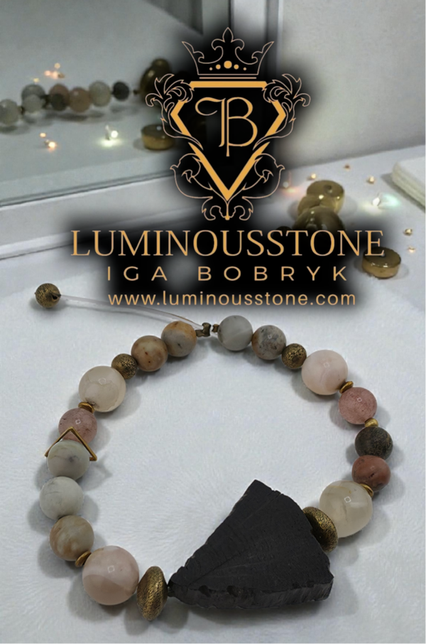 This composition features gentle strength and enduring history! It combines warm, powdered shades (Flower Agat, Strawberry Quartz, Jaspis Zebra) and a handcrafted bead made of Black Bog Oak (Bog Oak), impregnated with real beeswax. Brass beads enhance grounding, giving the piece a rustic elegance and a harmonious, powdered glow.